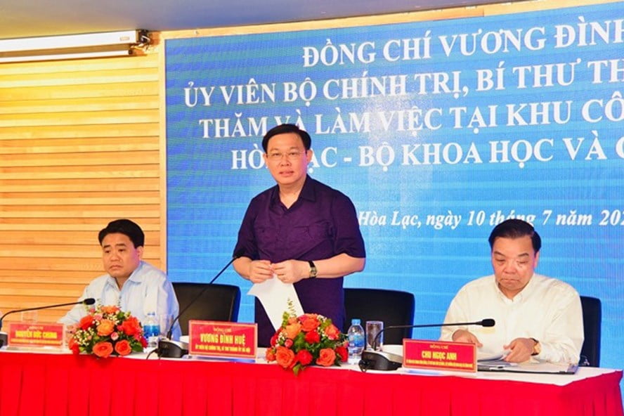 Ngày 10.7, Bí thư Thành uỷ Hà Nội Vương Đình Huệ đã đi thăm và làm việc với Khu Công nghệ cao (CNC) Hòa Lạc.